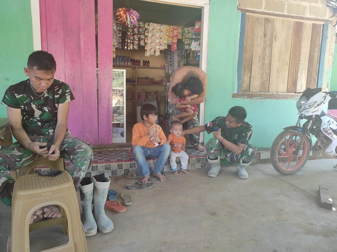 Hal ini dilakukan anggota Satgas TMMD 111 untuk selalu menjalalin keharmonisan kedapa masyarakat terkhusus anak anak , Ke akrban yang terlihat ini berada di salah satu toko di Desa setangau jaya yaitu di tokoh ibu mirnadi.